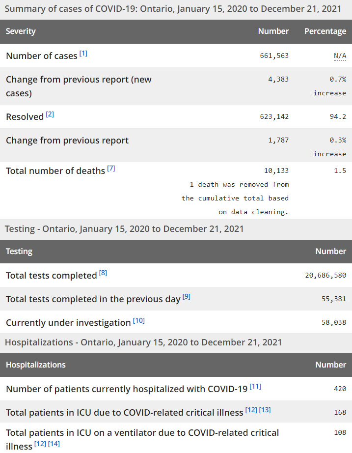 再看看安省方面的详细数据,截止12月21日,安省已对20,686,580例进行了新冠病毒检测(检测数较昨天新增55,381),还有58,038处于被调查阶段。确诊总数661,563(当天新增4,383;阳性率上升至7.91%),包括623,142例康复(康复率下降为94.2%)、10,133例死亡(增加10例,死亡率仍为1.5%)。住院患者420例(增加8);进入ICU患者168例(增加3);IU插呼吸机患者108(增加3)。另:多伦多各个社区的疫情地图请点击这里。