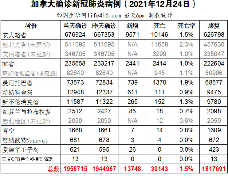 【加国生活网编译报道】12月25日至26日圣诞节疫情报道暂停,因为从12月24日起,加拿大好多省份进入圣诞假期模式,连续四五天没有数据更新,直至12月29日才会有更新,因此以下数据从12月24日起在接下来的五天内会处于更新不稳定状态。截至2021年12月24日下午6点,加拿大新冠确诊病例总数为1958715(新增13748),死亡30143(新增12)。安省确诊总数676924(新增9571);魁省官方没有公布具体数据,只有新闻报道的新增超过1万例;BC省确诊总数235658(新增2441);曼省确诊总数73573(新增739);新斯科舍省确诊总数12948(新增611);新不伦瑞克省确诊总数11587(新增265)。从12月24日起,加拿大好多省份进入圣诞假期模式,连续四五天没有数据更新;安省新增9,571例确诊病例,四创安省自疫情以来的单日新增病例的最高纪录,安省首席卫生官预测创纪录的每日病例数可能会成为未来几周的常态。加国生活网专门制作了如下统计数据表: