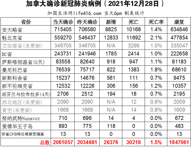 【加国生活网编译报道】截至2021年12月28日下午6点,加拿大新冠确诊病例总数为为2061057(新增26376,数据不全),死亡30218(5天新增63)。安省确诊总数715405(新增8825);魁省确诊总数559270(新增12833);BC省确诊总数243731(新增1785);萨省确诊总数83558(5天新增918);曼省确诊总数76539(新增822);新斯科舍省确诊总数15237(新增561);新不伦瑞克省确诊总数12532(新增306);目前大部分省份仍处于官方数据平台未更新状态,相关数据来自各自省份的最新新闻稿。魁省新增12,833例,再创自疫情以来的最高纪录。由于卫生保健系统压力越来越大,魁省允许检测呈阳性卫生人员继续工作。加国生活网专门制作了如下统计数据表: