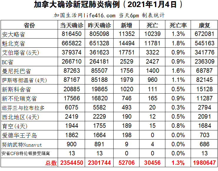 【加国生活网编译报道】截至2022年1月4日下午6点,加拿大新冠确诊病例总数为2354450(新增52706,部分省份是4-5天数据,当天新增36033),死亡30456(新增57,包括部分省份4-5天数据)。安省确诊总数816450(新增11352);魁省确诊总数665822(新增14494);艾省确诊总数379374(5天新增17751,当天新增3013);BC省确诊总数266710(新增2529);曼省确诊总数87263(新增1756);萨省确诊总数87167(4天新增1979,当天新增326);新斯科舍省确诊总数20855(新增1020);新不伦瑞克省确诊总数17566(新增746);纽芬兰与拉布拉多省确诊总数6075(新增493)。安省当天新增病例超过1万,由于安省最近限制谁有资格进行PCR检测,安省新冠科学咨询组估计,目前约有五分之一的病例被PCR检测所确认,也就是说,安省的新增病例有可能会高达5万。加国生活网专门制作了如下统计数据表: