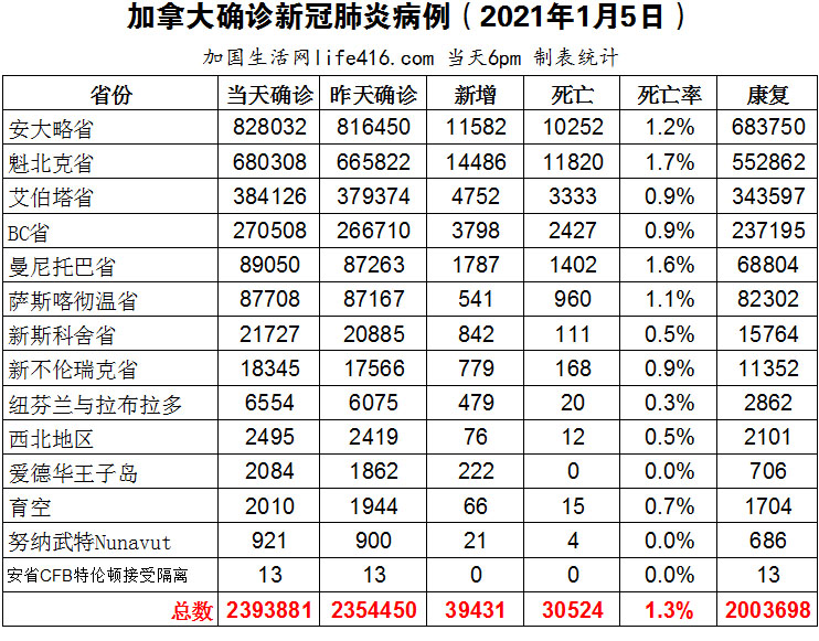 【加国生活网编译报道】截至2022年1月5日下午6点,加拿大新冠确诊病例总数为2393881(新增39431),死亡30524(新增68)。安省确诊总数828032(新增11582);魁省确诊总数680308(新增14486);艾省确诊总数384126(新增4752);BC省确诊总数270508(新增3798);曼省确诊总数89050(新增1787);萨省确诊总数87708(新增541);新斯科舍省确诊总数21727(新增842);新不伦瑞克省确诊总数18345(新增779);纽芬兰与拉布拉多省确诊总数6554(新增479)。加拿大总理表示,加拿大人对仍然拒绝接种疫苗的人感到越来越愤怒和沮丧;由Omicron变异病毒所引发的疫情继续在加拿大各个社区蔓延,当日全国新增确诊病例高达39431例;拥有30处突变的Omicron变异病毒正在全球肆虐,拥有46处突变的全新变异病毒B.1.640.2已经悄然出现。加国生活网专门制作了如下统计数据表: