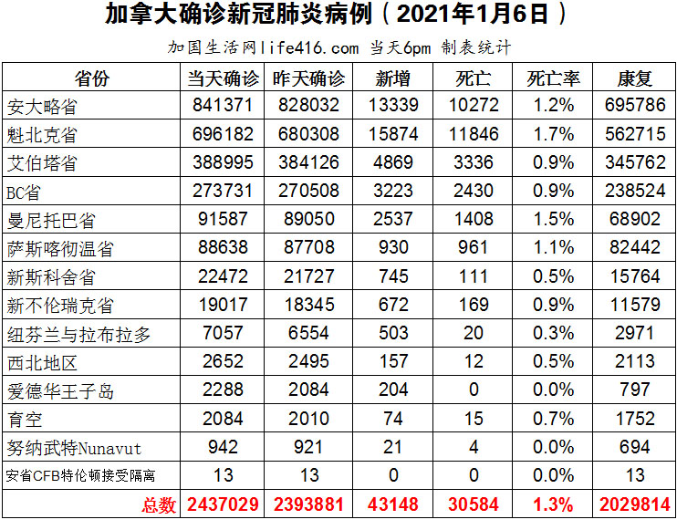 【加国生活网编译报道】截至2022年1月6日下午6点,加拿大新冠确诊病例总数为2437029(新增43148),死亡30584(新增60)。安省确诊总数841371(新增13339);魁省确诊总数696182(新增15874);艾省确诊总数388995(新增4869);BC省确诊总数273731(新增3223);曼省确诊总数91587(新增2537);萨省确诊总数88638(新增930);新斯科舍省确诊总数22472(新增745);新不伦瑞克省确诊总数19017(新增672);纽芬兰与拉布拉多省确诊总数7057(新增503)。联邦政府本月将在全国分发1.4 亿份快速检测试剂,虽然安省将收到1亿1900万份,但大部分民众无法获得使用;魁省医疗卫生系统出现用工荒,约2万名工作人员确诊阳性而无法工作;安省当天20例死亡病例,创自去年5月下旬以来的最高单日死亡纪录;由多伦多临床评估科学研究所近日发表的研究报告指出,两剂疫苗基本不能阻挡感染Omicron变异病毒,第三剂疫苗有效率也仅有37%;专家谈感染新冠病毒后会有什么样的感觉以及如何在家进行自我治疗。加国生活网专门制作了如下统计数据表: