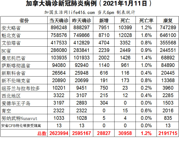 【加国生活网编译报道】截至2022年1月11日下午6点,加拿大新冠确诊病例总数为2623994(新增28827),死亡30958(新增96)。安省确诊总数896248(新增7951);魁省确诊总数758576(新增8710);艾省确诊总数417533(新增4704);BC省确诊总数286080(新增2239);曼省确诊总数103935(新增2002);萨省确诊总数94080(新增1140);新斯科舍省确诊总数26564(新增616);新不伦瑞克省确诊总数20890(新增191);纽芬兰与拉布拉多省确诊总数10201(新增750)。加拿大总理承诺将为所有符合条件的加拿大人提供足够的疫苗,以及在必要时获得第四剂疫苗;魁省出台更严厉卫生措施,拒绝接种第一剂疫苗的成年人将不得不支付“医疗保健费用”;安省重症监护室患者创自疫情以来的最高纪录;世界卫生组织警告不要将Omicron描述为“温和”的变异病毒。加国生活网专门制作了如下统计数据表: