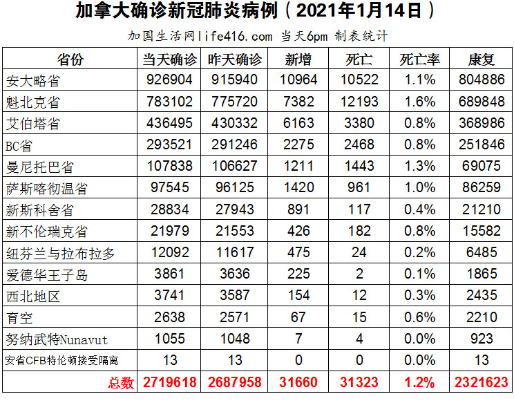 【加国生活网编译报道】截至2022年1月14日下午6点,加拿大新冠确诊病例总数为2719618(新增31660),死亡31323(新增133)。安省确诊总数926904(新增10964);魁省确诊总数783102(新增7382);艾省确诊总数436495(新增6163);BC省确诊总数293521(新增2275);曼省确诊总数107838(新增1211);萨省确诊总数97545(新增1420);新斯科舍省确诊总数28834(新增891);新不伦瑞克省确诊总数21979(新增426);纽芬兰与拉布拉多省确诊总数12092(新增475)。根据加拿大公共卫生部最新发布的预测模型显示每天可能有多达15万例新增确诊病例;安省新增1096例确诊病例,专家质疑安省1月17日恢复面对面上课的决定;安省一些教育局称有可能在最后一刻临时取消面对面上课;PEI打破保持已久的零死亡纪录,新增2例死亡病例。加国生活网专门制作了如下统计数据表:
