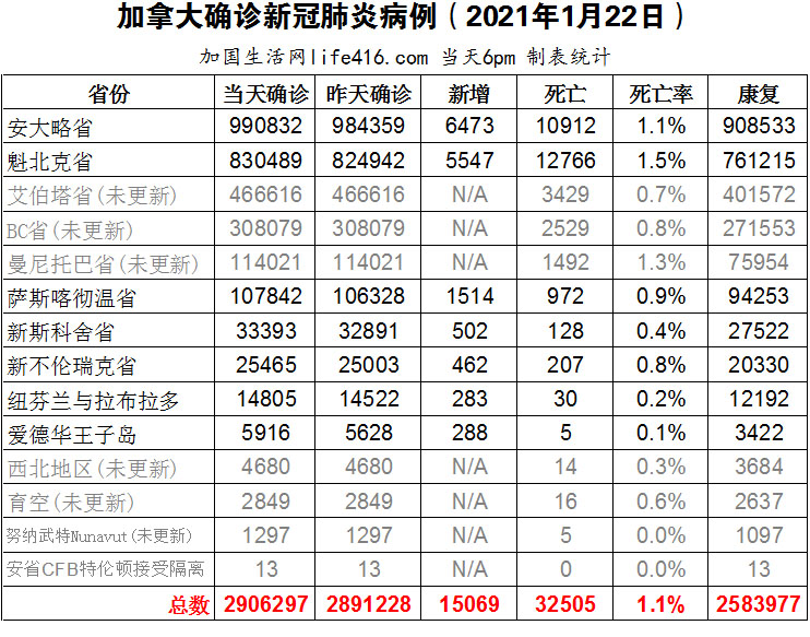 【加国生活网编译报道】截至2022年1月22日下午6点,加拿大新冠确诊病例总数为2906297(新增15069),死亡32505(新增125)。安省确诊总数990832(新增6473);魁省确诊总数830489(新增5547);萨省确诊总数107842(新增1514);新斯科舍省确诊总数33393(新增502);新不伦瑞克省确诊总数25465(新增462);纽芬兰与拉布拉多省确诊总数14805(新增283);爱德华王子岛确诊总数5916(新增288);其余省份逢周末没有更新。为什么说Omicron的出现表明是人类更新新冠疫苗的时候了?加国生活网专门制作了如下统计数据表: