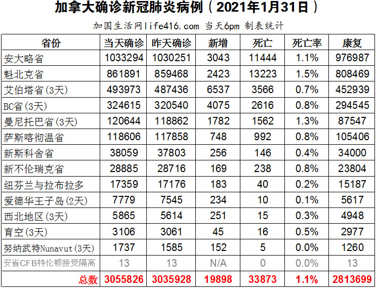 【加国生活网编译报道】截至2022年1月31日下午6点,加拿大新冠确诊病例总数为3055826(3天新增19898,当天新增10843),死亡33873(3天新增151)。安省确诊总数1033294(新增3043);魁省确诊总数861891(新增2423);艾省确诊总数493973(3天新增6537,当天新增1777);BC省确诊总数324615(3天新增4075,当天新增1057);曼省确诊总数120644(3天新增1782,当天新增505);萨省确诊总数118606(新增748)。选择加强剂疫苗,辉瑞或Moderna哪个更好?快看专家的回答;加拿大总理宣布他的新冠病毒检测呈阳性。加国生活网专门制作了如下统计数据表: