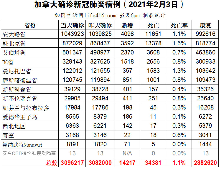 【加国生活网编译报道】截至2022年2月3日下午6点,加拿大新冠确诊病例总数为3096217(新增14217),死亡34381(新增169)。安省确诊总数1043923(新增4098);魁省确诊总数872029(新增3592);艾省确诊总数501347(新增2370);BC省确诊总数329143(新增1518);曼省确诊总数122012(新增357);萨省确诊总数120745(新增851)。加拿大疫苗接种运动已经接近一个“里程碑”,近85%的总人口(超过89%符合条件的人群)至少接种了一剂疫苗,约80%的总人口(超过83%符合条件的人群)已完全接种了疫苗(二剂疫苗);安省首席卫生官表示,就算法律层面的口罩强制令被取消,省府也还是会建议民众戴好口罩。加国生活网专门制作了如下统计数据表:
