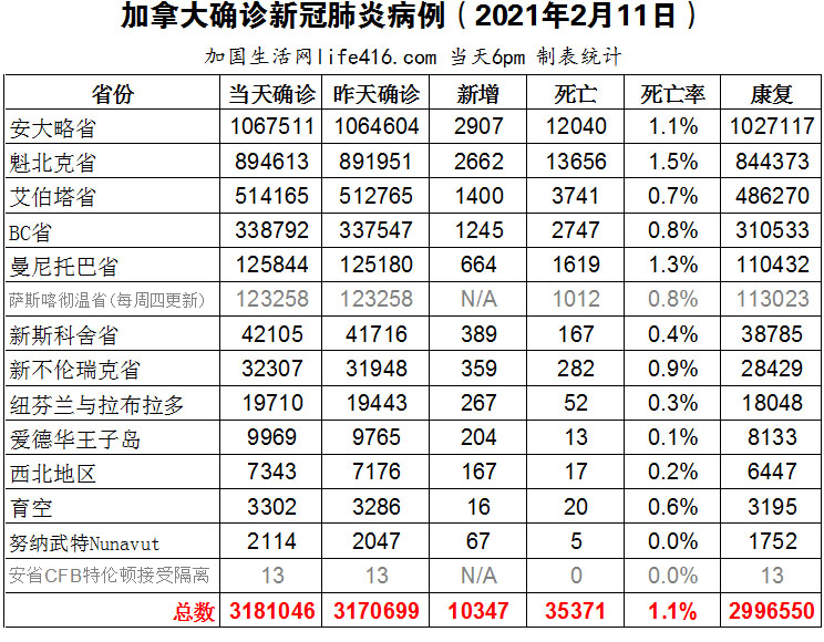 【加国生活网编译报道】截至2022年2月11日下午6点,加拿大新冠确诊病例总数为3181046(新增10347),死亡35371(新增140)。安省确诊总数1067511(新增2907);魁省确诊总数894613(新增2662);艾省确诊总数514165(新增1400);BC省确诊总数338792(新增1245);曼省确诊总数125844(新增664)。加拿大卫生部长承认加拿大和其他国家一样正在想办法“与病毒共存”,他认为这意味着每天死于新冠病毒的人会大幅减少,并且该病毒可以在社会中传播而不会“瘫痪”医疗保健系统。不过,他也警告说,各省和地区应该做好准备,随着卫生限制措施的减少,未来几个月出现的变异病毒会带来“令人不快的意外”。加国生活网专门制作了如下统计数据表: