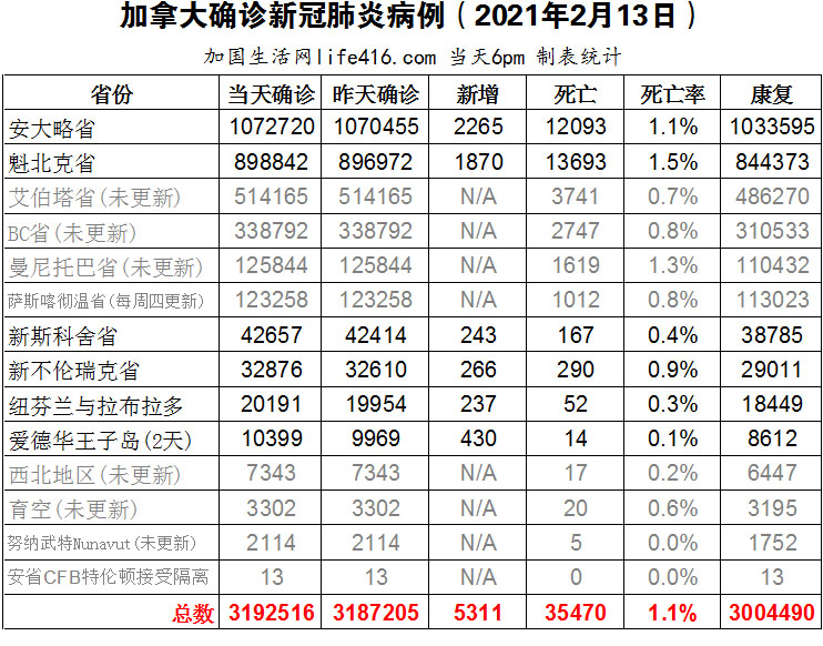 安省在2月13日新增2,265例确诊病例,使确诊病例总数达1,072,720例。当天还新增18例死亡病例,使安省新冠死亡总数高达12,093例。