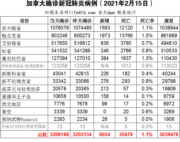 【加国生活网编译报道】截至2022年2月15日下午6点,加拿大新冠确诊病例总数为3209168(新增6034),死亡35679(新增99)。安省确诊总数1076078(新增1593);魁省确诊总数902246(新增1973);艾省确诊总数517650(新增838);BC省确诊总数341532(新增246);曼省确诊总数127394(新增384)。加拿大将取消完全接种疫苗旅客入境前PCR检测;BC省从2月16日起解除大部分卫生限制措施,但仍保持口罩要求和疫苗护照;魁省将在3月14日之前取消对所有公共场所的疫苗护照要求。加国生活网专门制作了如下统计数据表: