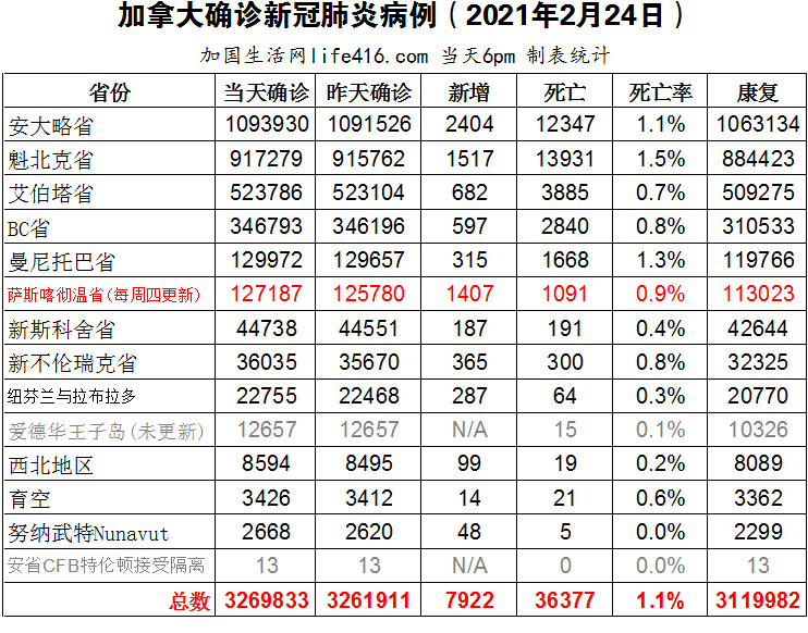【加国生活网编译报道】截至2022年2月24日下午6点,加拿大新冠确诊病例总数为3269833(新增7922),死亡36377(新增123)。安省确诊总数1093930(新增2404);魁省确诊总数917279(新增1517);艾省确诊总数523786(新增682);BC省确诊总数346793(新增597);曼省确诊总数129972(新增315)。继上周批准Novavax后,加拿大卫生部于2月24日宣布批准第六种疫苗——来自加拿大本土来自魁北克市的Medicago生物制药公司所生产的植物性新冠疫苗“Covifenz”用于加拿大18至64岁的成年人。加国生活网专门制作了如下统计数据表: