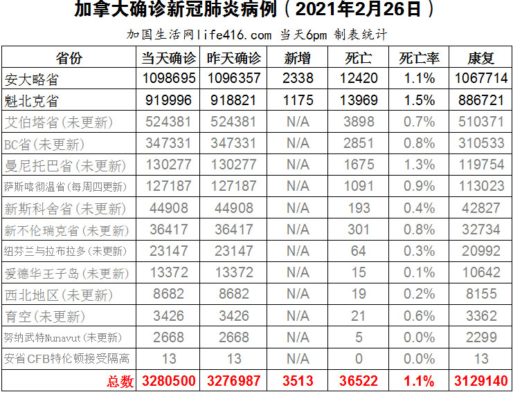 【加国生活网编译报道】截至2022年2月26日下午6点,加拿大新冠确诊病例总数为3280500(新增3513),死亡36522(新增48)。安省确诊总数1098695(新增2338);魁省确诊总数919996(新增1175);其余省份均未更新数据。随着由Omicron所引发的“第五波”疫情在加拿大大部分地区逐渐消退,加拿大人正在进入一个相对平静的时期。但是新冠病毒的测试仍然受到严格限制,使加拿大国民很容易受到未来出现的变异病毒的影响。如果加拿大不会重新启动广泛的PCR检测的话,专家认为加拿大需要建立其他新冠病毒监测系统,比如国家废水监测系统。加国生活网专门制作了如下统计数据表:
