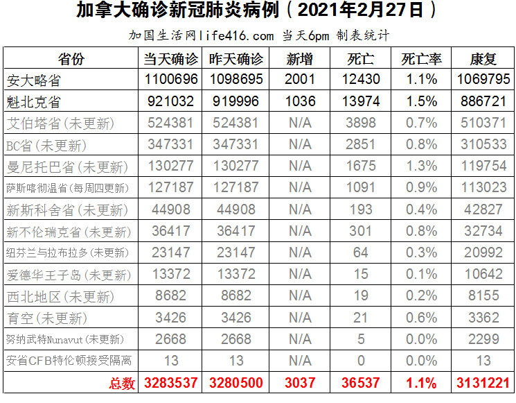 【加国生活网编译报道】截至2022年2月27日下午6点,加拿大新冠确诊病例总数为3283537(新增3037),死亡36537(新增15)。安省确诊总数1100696(新增2001);魁省确诊总数921032(新增1036);其余省份均未更新数据。面对加拿大各省纷纷宣布放宽卫生限制措施,加拿大联邦首席卫生官Theresa Tam博士则在最近的新闻发布会上表示戴口罩是预防新冠病毒的“最基本保护”,而她警告国民要做好准备,“情况可能再次发生变化,新冠病毒卷土重来”,所有公共卫生限制措施会随时恢复。加国生活网专门制作了如下统计数据表: