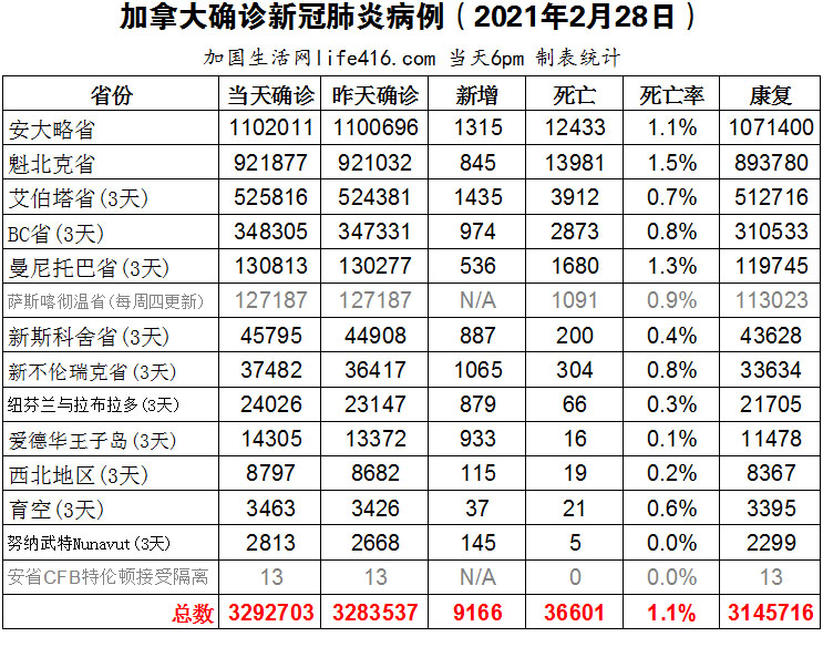 【加国生活网编译报道】截至2022年2月28日下午6点,加拿大新冠确诊病例总数为3292703(3天新增9166,当天新增6994),死亡36601(新增64)。安省确诊总数1102011(新增1315);魁省确诊总数921877(新增845);艾省确诊总数525816(3天新增1435,当天新增383);BC省确诊总数348305(3天新增974,当天新增279);曼省确诊总数130813(3天新增536,当天新增111)。就在加拿大首席卫生官警告国民不要摘掉口罩、新冠疫情随时会卷土重来之际,加拿大又有好几个省份从今天起取消了旨在控制新冠疫情的卫生限制措施,萨省甚至还取消了室内口罩强制令要求;加拿大研究人员发现了第一例鹿将新冠病毒传播给人类的可能案例。加国生活网专门制作了如下统计数据表: