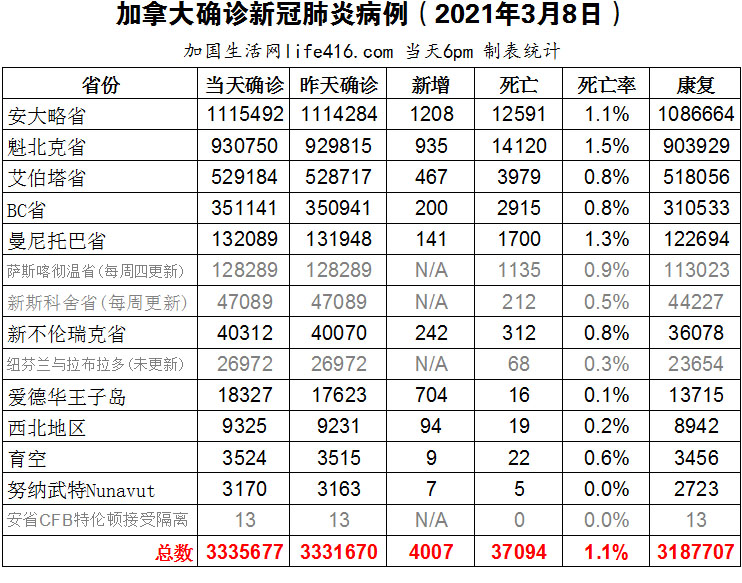 【加国生活网编译报道】截至2022年3月8日下午6点,加拿大新冠确诊病例总数为3335677(新增4007),死亡37094(新增55)。安省确诊总数1115492(新增1208);魁省确诊总数930750(新增935);艾省确诊总数529184(新增467);BC省确诊总数351141(新增200);曼省确诊总数132089(新增141)。周一发表在《自然》杂志上发表的两项针对新冠病毒的研究而受到关注:一项研究确定了新冠重症患者的16种新遗传差异;另一项研究发现新冠病毒会导致大脑萎缩、减少控制情绪和记忆的区域的灰质,并破坏控制嗅觉的区域。加国生活网专门制作了如下统计数据表:
