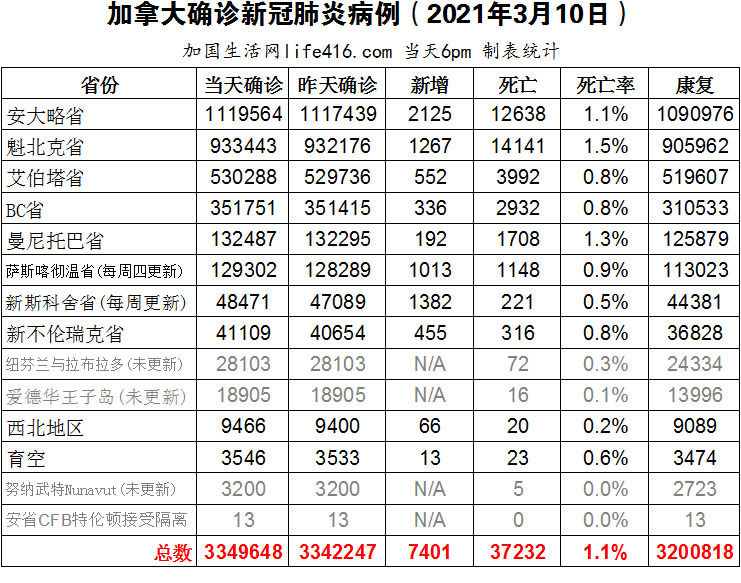 【加国生活网编译报道】截至2022年3月10日下午6点,加拿大新冠确诊病例总数为3349648(新增7401),死亡37232(新增75)。安省确诊总数1119564(新增2125);魁省确诊总数933443(新增1267);艾省确诊总数530288(新增552);BC省确诊总数351751(新增336);曼省确诊总数132487(新增192)。虽然新冠病毒在加拿大各地传播的真实规模仍不确定,PCR检测规模又大幅缩减,但加拿大各个省和地区都已经或将在接下来的几周内陆续开始取消口罩强制令,加拿大人只能自己想办法来降低感染新冠病毒的风险了,因为专家表示现在摘口罩还为时过早。加国生活网专门制作了如下统计数据表: