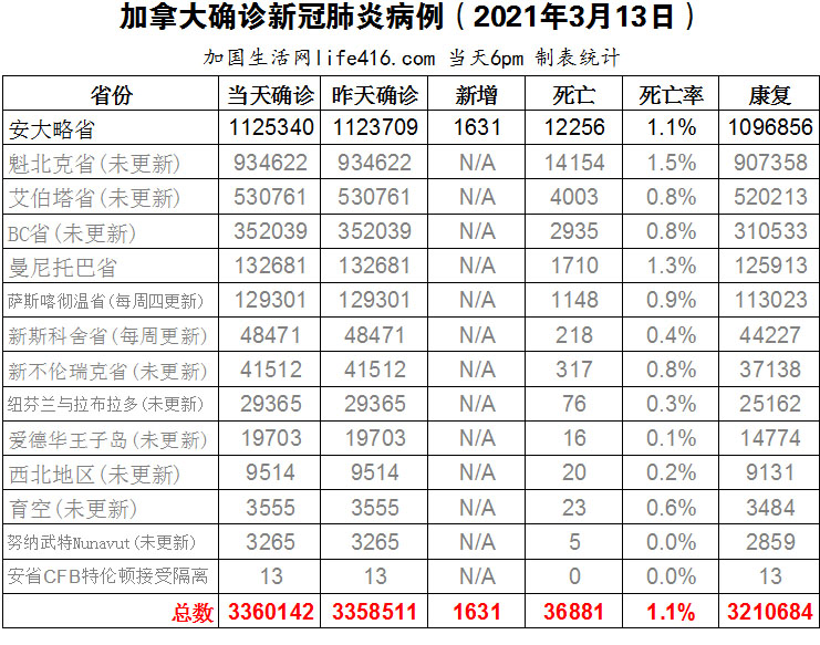 【加国生活网编译报道】截至2022年3月13日下午6点,加拿大新冠确诊病例总数为3360142(新增1631),死亡36881(增加9)。安省确诊总数1125340(新增1631);其余省份在周末均未更新。加拿大各省目前纷纷“解封”阶段,不仅大范围地解除公共卫生限制措施,甚至还解除了口罩强制令。各省的工作重点也已经转移,从控制病毒,到转向学习与病毒共存。不过,这种转变一直存在争议,连加拿大的传染病专家们的态度也不太一致,有些持谨慎乐观的态度,有些则发出警告称加拿大还未到将新冠病毒当作是流感病毒的那一刻。加国生活网专门制作了如下统计数据表: