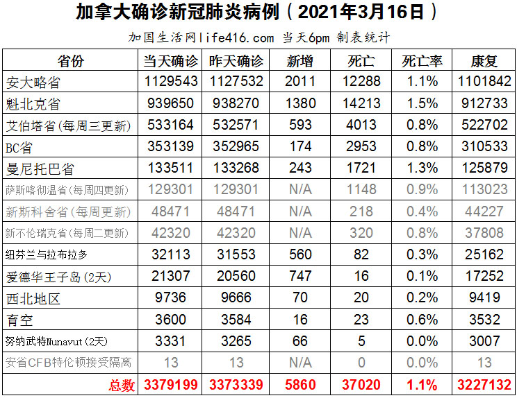【加国生活网编译报道】截至2022年3月16日下午6点,加拿大新冠确诊病例总数为3379199(新增5860),死亡37020(增加30)。安省确诊总数1129543(新增2011);魁省确诊总数939650(新增1380);艾省确诊总数533164(新增593);BC省确诊总数353139(新增174);曼省确诊总数133511(新增243)。世界卫生组织在3月15日表示,全球新冠确诊病例又呈上升趋势,目前的数据可能预示着更大的问题,并警告各国对新冠病毒保持警惕,目前增加的病例只是“冰山一角”;据消息人士称,加拿大联邦政府将于明天宣布进入加拿大的完全接种疫苗旅客很快将不再需要进行抵达前的新冠病毒测试。加国生活网专门制作了如下统计数据表: