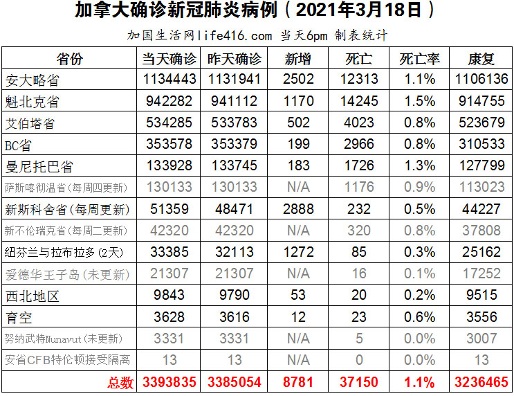 【加国生活网编译报道】截至2022年3月18日下午6点,加拿大新冠确诊病例总数为3393835(新增8781),死亡37150(增加49)。安省确诊总数1134443(新增2502);魁省确诊总数942282(新增1170);艾省确诊总数534285(新增502);BC省确诊总数353578(新增199);曼省确诊总数133928(新增183)。根据废水中检测到的新冠病毒的上升(每天感染人数达1.5-2万)以及安省将在下周结束大部分省级公共卫生措施,安省新冠科学组预测更多的人将在医院接受治疗,一些人甚至需要重症监护;加拿大卫生部已批准将Moderna疫苗用于6至11岁的儿童。加国生活网专门制作了如下统计数据表: