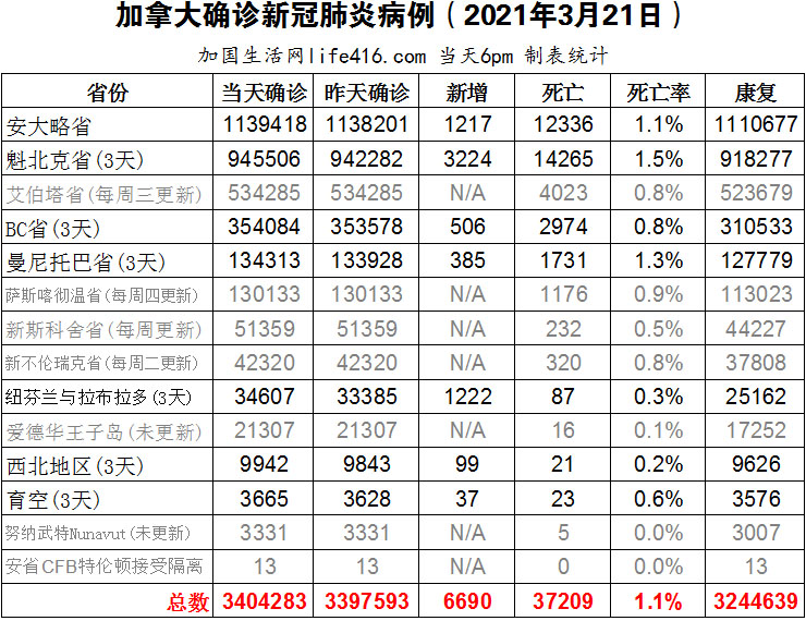 【加国生活网编译报道】截至2022年3月21日下午6点,加拿大新冠确诊病例总数为3404283(3天新增6690,当天新增2705),死亡37209(3天新增40)。安省确诊总数1139418(新增1217);魁省确诊总数945506(3天新增3224,当天新增907);BC省确诊总数354084(3天新增506,当天新增136);曼省确诊总数134313(3天新增385,当天新增77);纽省确诊总数34607(3天新增1222,当天新增324);艾省改为每周三更新数据。安省从3月21日起取消了包括学校、餐馆、健身房和商店在内的大多数室内环境的口罩强制令;加拿大国际发展部长希望世卫组织批准加拿大本土公司Medicago所生产的植物性新冠疫苗Covifenz,以便该疫苗能被捐赠和使用,但世卫组织上周暂停了该疫苗的资格预审程序。加国生活网专门制作了如下统计数据表: