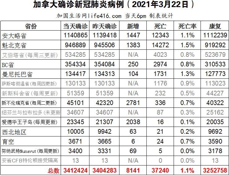 【加国生活网编译报道】截至2022年3月22日下午6点,加拿大新冠确诊病例总数为3412424(新增8141),死亡37240(新增31)。安省确诊总数1140865(新增1447);魁省确诊总数946889(新增1383);BC省确诊总数354334(新增250);曼省确诊总数134417(新增104);新不伦瑞克省确诊总数45101(一周新增2781);爱德华王子岛确诊总数23345(一周新增2038)。由于安省从3月21日起取消了大多数场所的口罩强制令,安省的每日疫情数据开始倍受关注起来。安省在3月22日新增1447例确诊病例,但由于PCR检测仍然受限,只能根据废水数据进行估计,安省新冠科学组估计,目前的每日新增确诊病例仍然在15,000至20,000之间。加国生活网专门制作了如下统计数据表: