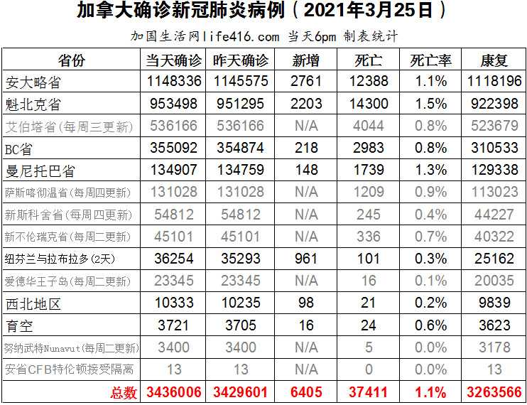 【加国生活网编译报道】截至2022年3月25日下午6点,加拿大新冠确诊病例总数为3436006(新增6405),死亡37411(新增45)。安省确诊总数1148336(新增2761);魁省确诊总数953498(新增2203);BC省确诊总数355092(新增218);曼省确诊总数134907(新增148)。世界卫生组织WHO在3月25日表示最终决定搁置加拿大魁北克省Medicago公司所生产的新冠疫苗Covifenz进入紧急使用清单的申请,WHO的这一决定实际上将Covifenz疫苗排除在全球疫苗共享倡议计划(COVAX)之外;安省新增2761例确诊病例,连续第三天超过2千例,且连续第三天处于上升趋势;约克区可能需要恢复口罩强制令。加国生活网专门制作了如下统计数据表: