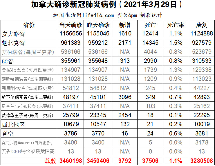 【加国生活网编译报道】截至2022年3月29日下午6点,加拿大新冠确诊病例总数为3460198(新增9792),死亡37506(新增45)。安省确诊总数1156656(新增1610);魁省确诊总数961383(新增2171);BC省确诊总数355961(新增313);新不伦瑞克省确诊总数48197(一周新增3096);爱德华王子岛确诊总数25799(一周新增2454)。美国疾病控制和预防中心 (CDC) 在3月29日宣布授权为50岁及以上的美国人接种第四剂辉瑞疫苗,同时美国食品和药物管理局还授权为12岁及以上免疫系统受损的人额外加强疫苗;安省住院患者继续增加;黑人科学家工作组呼吁黑人社区成员在高风险环境中继续戴口罩,并确保接种第三剂疫苗。加国生活网专门制作了如下统计数据表: