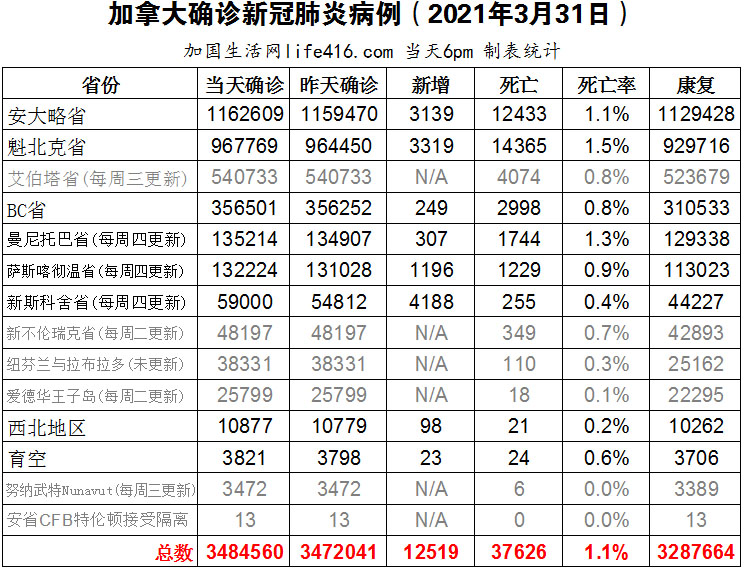 【加国生活网编译报道】截至2022年3月31日下午6点,加拿大新冠确诊病例总数为3484560(新增12519),死亡37626(新增55)。安省确诊总数1162609(新增3139);魁省确诊总数967769(新增3319);BC省确诊总数356501(新增249);曼省确诊总数135214(一周新增307);萨省确诊总数132224(一周新增1196);新斯科舍省确诊总数59000(一周新增4188)。即便安省卫生部长Christine Elliott承认安省正处于第六波疫情中,省府也没有计划重新引入口罩强制令或暂停其重新开放计划;安省卫生部在3月31日宣布,将从4月4日起正式接管安省新冠科学咨询组的运作。加国生活网专门制作了如下统计数据表: