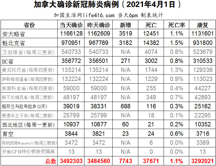【加国生活网编译报道】截至2022年4月1日下午6点,加拿大新冠确诊病例总数为3492303(新增7743),死亡37671(新增45)。安省确诊总数1166128(新增3519);魁省确诊总数970951(新增3182);BC省确诊总数356772(新增271)。加拿大首席卫生官Theresa Tam 博士在4月2日发布最新联邦模型,模型显示未来几周确诊病例将会增加,因为更具传染性的BA.2亚变体正在加拿大境内广泛传播。预计病例增加不会是线性上升,有可能会是更多的波动。虽然预计确诊病例数会增加,但Theresa Tam 博士表示,现在联邦卫生部对确诊病例增加的反应将与过去有所不同。加国生活网专门制作了如下统计数据表: