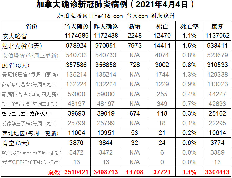 【加国生活网编译报道】截至2022年4月4日下午6点,加拿大新冠确诊病例总数为3510421(3天新增11708,当天新增5019),死亡37721(新增31)。安省确诊总数1174686(新增2248);魁省确诊总数978924(3天新增7973,当天新增2331);BC省确诊总数357586(3天新增728,当天新增255);纽芬兰与拉布拉多省确诊总数39693(3天新增674,当天新增154)。由于安省已经取消了大部分公共卫生措施,专家们呼吁应实施新的疫苗策略,着重提高第三剂疫苗接种率和儿童疫苗接种率,以及准备为更多人接种第四剂疫苗;多伦多首席卫生官鼓励市民应继续尽可能多地戴口罩。加国生活网专门制作了如下统计数据表: