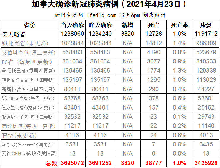 【加国生活网编译报道】截至2022年4月23日下午6点,加拿大新冠确诊病例总数为3695072(新增3820),死亡38777(新增24)。安省确诊总数1238060(新增3820);其余省份逢周末不更新。自Omicron出现以来,加拿大的新冠免疫格局已经完全改变,BC省的一项最新研究表明:几乎一半的加拿大人可能感染了新冠病毒。加拿大现在拥有“非常复杂”的免疫环境,那么这种情况是好还是坏?快看专家分析!加国生活网专门制作了如下统计数据表:
