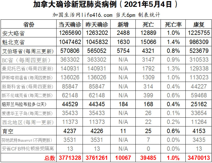 【加国生活网编译报道】截至2022年5月4日下午6点,加拿大新冠确诊病例总数为3771328(新增10067),死亡39485(新增133)。安省确诊总数1265690(新增2488);魁省确诊总数1047462(新增1630);艾省确诊总数570806(一周新增5754)。UBC大学本周在美国医学会杂志发表了一项最新研究,对于在新冠疫情期间怀孕的加拿大人来说,没有接种疫苗的孕妇比接种疫苗的孕妇更容易受到新冠重症的影响;安省废水数据中的住院和感染人数正在逐渐放缓;魁省将于5月14日正式取消其室内口罩强制令。加国生活网专门制作了如下统计数据表: