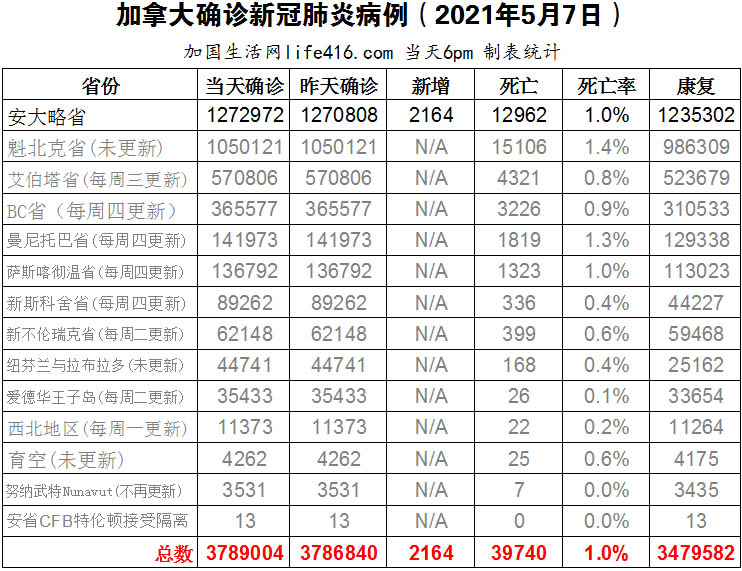 【加国生活网编译报道】截至2022年5月7日下午6点,加拿大新冠确诊病例总数为3789004(新增2164),死亡39740(新增24)。安省确诊总数1272972(新增2164);其余省份逢周末不更新。加拿大的一项新研究发现,曾经感染过新冠病毒加上疫苗接种可为未来的Omicron再感染和住院重症提供强有力的保护。该研究结果还强调了在先前感染新冠重症的人群中,加强剂疫苗的保护作用有限,加拿大的优先接种加强剂疫苗的计划有可能会发生变化。不过,NACI表示目前没有计划改变加强剂疫苗指南。加国生活网专门制作了如下统计数据表: