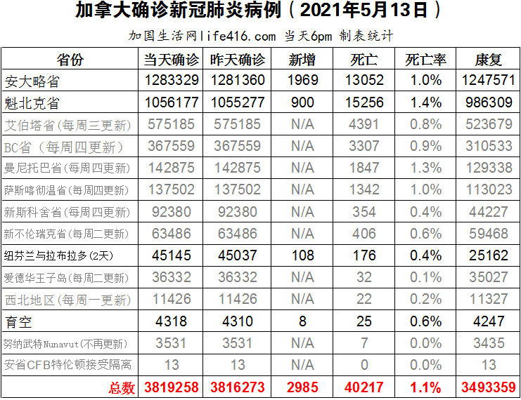 【加国生活网编译报道】截至2022年5月13日下午6点,加拿大新冠确诊病例总数为3819258(新增2985),死亡40217(新增48)。安省确诊总数1283329(新增1969);魁省确诊总数1056177(新增900)。根据加拿大公共卫生部在5月13日公布的数据显示,新不伦瑞克省拥有全国最高的新冠检测阳性率29.7%,是加拿大全国平均水平12.7%的两倍多。此外,新斯科舍省和爱德华王子岛分列第二和第三,分别为26.4%和24.5%;魁北克省阳性率最低为8.5%;安省的阳性率已从上周的14%降至约12%。加国生活网专门制作了如下统计数据表: