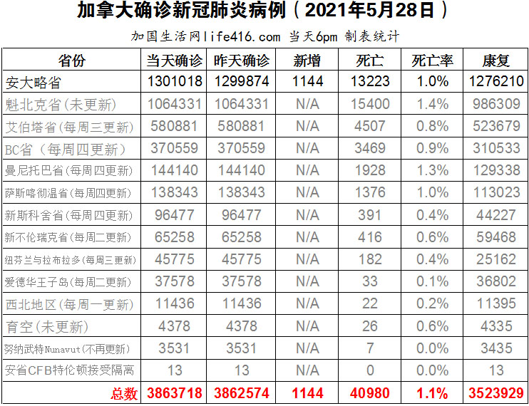 【加国生活网编译报道】截至2022年5月28日下午6点,加拿大新冠确诊病例总数为3863718(新增1144),死亡40980(新增13)。安省确诊总数1301018(新增1144);其余省份逢周末不更新。安省在5月28日新增1,144例确诊病例和13例死亡病例,使死亡总数达13,223例。目前安省医院共有865例住院患者,不仅低于一周前的1116例,而且连续第二天低于1千例(昨天是948例);重症监护室患者144例,创6个月来(2021年11月28日135例)的最低ICU入住率。加国生活网专门制作了如下统计数据表: