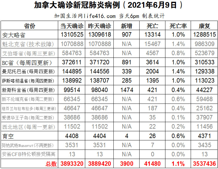 【加国生活网编译报道】截至2022年6月9日下午6点,加拿大新冠确诊病例总数为3893320(新增3900),死亡41480(新增132)。安省确诊总数1310525(新增907);BC省确诊总数372611(一周新增891);曼省确诊总数144895(一周新增339);萨省确诊总数138992(一周新增285);新斯科舍省确诊总数99514(一周新增1474);魁省因技术故障没有更新数据。安省新冠科学咨询组新任科学主任Fahad Razak博士表示,虽然关键指标表明安省的新冠疫情正在改善,但他希望在高风险环境中看到所有剩余的口罩规定再实施一段时间。加国生活网专门制作了如下统计数据表: