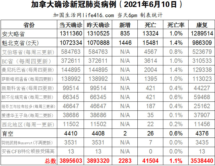 【加国生活网编译报道】由于周末只有安省更新数据,安省又从6月11日起改成每周更新数据,加国生活网周末疫情报道只能暂停。截至2022年6月10日下午6点,加拿大新冠确诊病例总数为3895603(2天新增2283,当天新增1557),死亡41504(新增24)。安省确诊总数1311360(新增835);魁省确诊总数1072334(2天新增1446,当天新增720)。安省卫生部在6月10日下午宣布将变更两年多来的每日新冠疫情数据报告方式,从每日报告改成每周报告。该变更将于6月11日生效,安省将从6月16日开始,每周四发布最新的疫情数据。加国生活网专门制作了如下统计数据表: