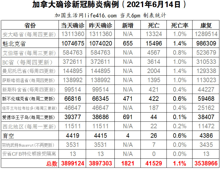 【加国生活网编译报道】截至2022年6月14日下午6点,加拿大新冠确诊病例总数为3899124(新增1821),死亡41529(新增17)。魁省确诊总数1074675(新增655);新不伦瑞克省确诊总数66816(一周新增471);爱德华王子岛确诊总数39377(一周新增691)。从6月20日开始,加拿大旅行者将不再被强制必须接种疫苗才能搭乘飞机或火车;联邦监管部门的联邦雇员和运输工人也将不再需要完全接种疫苗作为他们工作的条件;因接种疫苗而休无薪行政假的人员将被邀请重返工作岗位。针对安省取消大部分剩余场所的口罩强制令的决定,安省新冠科学咨询组负责指出,最好还是要戴口罩。加国生活网专门制作了如下统计数据表: