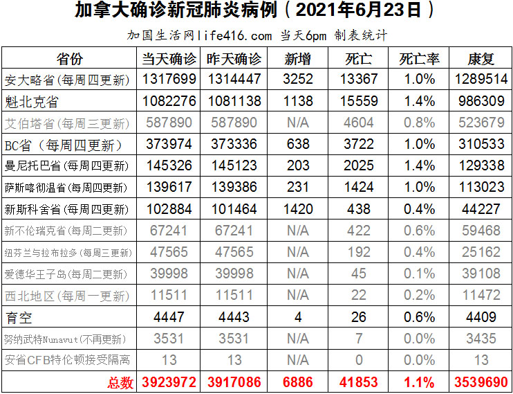 【加国生活网编译报道】6月24日至6月26日加拿大各省没有疫情数据更新,疫情报道暂停。截至2022年6月23日下午6点,加拿大新冠确诊病例总数为3923972(新增6886),死亡41853(新增91)。安省确诊总数1317699(一周新增3252);魁省确诊总数1082276(新增1138);BC省确诊总数373974(一周新增638);曼省确诊总数145326(一周新增203);萨省确诊总数139617(一周新增231);新斯科舍省确诊总数102884(一周新增1420)。根据哈佛医学院Beth Israel Deaconess Medical Center 医疗中心研究人员的最新数据显示,Omicron亚变体 BA.4 和 BA.5 似乎在既往感染过新冠的人以及已完全接种疫苗和加强剂疫苗的人中都“完美”地逃脱了抗体反应。加国生活网专门制作了如下统计数据表: