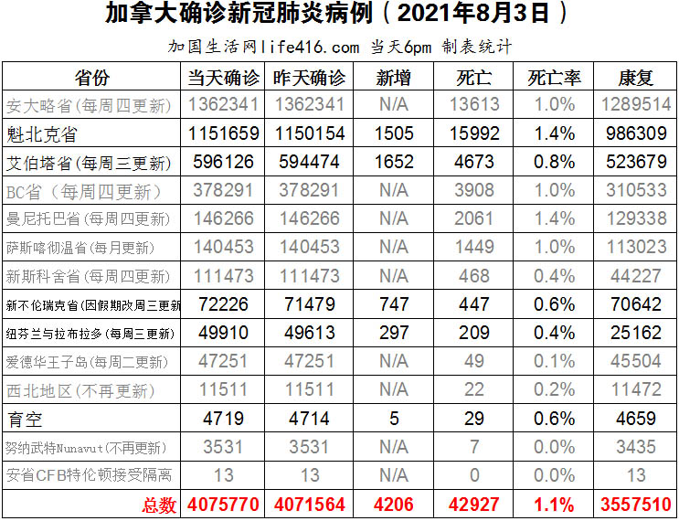 【加国生活网编译报道】截至2022年8月3日下午6点,加拿大新冠确诊病例总数为4075770(新增4206),死亡42927(新增39),魁省确诊总数1151659(新增1505,死亡新增21例);艾省确诊总数596126(一周新增1652);新不伦瑞克省确诊总数72226(一周新增747例);纽芬兰与拉布拉多省确诊总数49910(一周新增297)。一项最新研究测试了面罩所能提供的新冠保护,发现许多面罩无法对外部飞沫产生高水平的保护;安省目前累计确诊猴痘病例423例,比一周前增长了15%;多伦多大学教授Adalsteinn Brown宣布离开安省新冠科学咨询组。加国生活网专门制作了如下统计数据表:
