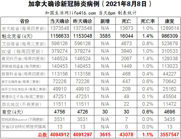 【加国生活网编译报道】截至2022年8月8日下午6点,加拿大新冠确诊病例总数为4094912(新增3615),死亡43078(新增35),魁省确诊总数1156633(新增3585,死亡新增34例)。安省教育部表示今年9月开学时,安省学校将不再实施口罩强制令。从2021-2022学年起,学校的大多数健康和安全要求将保持不变,其中包括自愿佩戴口罩。如果学生选择使用口罩,省府将继续免费为学生提供高质量的口罩,并为员工提供N95口罩,学校董事会将继续获得按照省级检测指导使用的快速抗原检测盒。加国生活网专门制作了如下统计数据表: