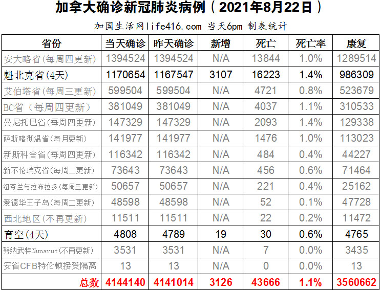 【加国生活网编译报道】截至2022年8月22日下午6点,加拿大新冠确诊病例总数为4144140(新增3126),死亡43666(新增28),魁省确诊总数1170654(4天新增3107,死亡新增28)。Moderna公司宣布将向加拿大供应1200万剂适用于Omicron变体的新冠疫苗,Moderna和加拿大政府已同意将公司针对原始病毒的600万剂疫苗转换为含有Omicron的二价疫苗,加拿大还将额外购买450万剂含有Omicron的候选疫苗,再加上原计划于2023年交付的150万剂二价候选疫苗提前到2022年交付 。加国生活网专门制作了如下统计数据表: