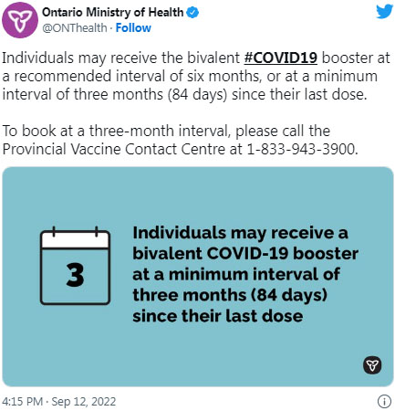 安省卫生部强调,无论省民已经接种了多少次加强剂疫苗,都可以在建议的六个月间隔内接受二价疫苗。但是安省卫生部仍在一条推文中表示省民也可以在其最后一次接种疫苗后至少三个月或84天的间隔内接受加强剂疫苗。如果是间隔三个月的,可致电省疫苗联络中心 1-833-943-3900 进行预约。