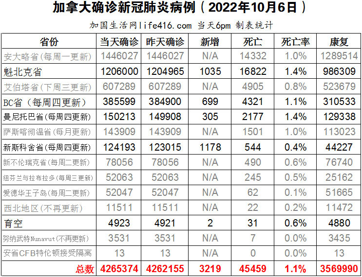 【加国生活网编译报道】截至2022年10月6日下午6点,加拿大新冠确诊病例总数为4265374(新增3219),死亡45459(新增60),魁省确诊总数1206000(新增1035,死亡新增5);BC省确诊总数385599(一周新增699,死亡新增38);曼省确诊总数150213(一周新增305,死亡新增17);新斯科舍省确诊总数124193(一周新增1178)。约克区卫生官员警告居民,新冠病毒仍在传播,疫情仍然令人担忧,而且在约克地区检测到病毒废水信号一直居高不下,并且再次开始上升。加国生活网专门制作了如下统计数据表: