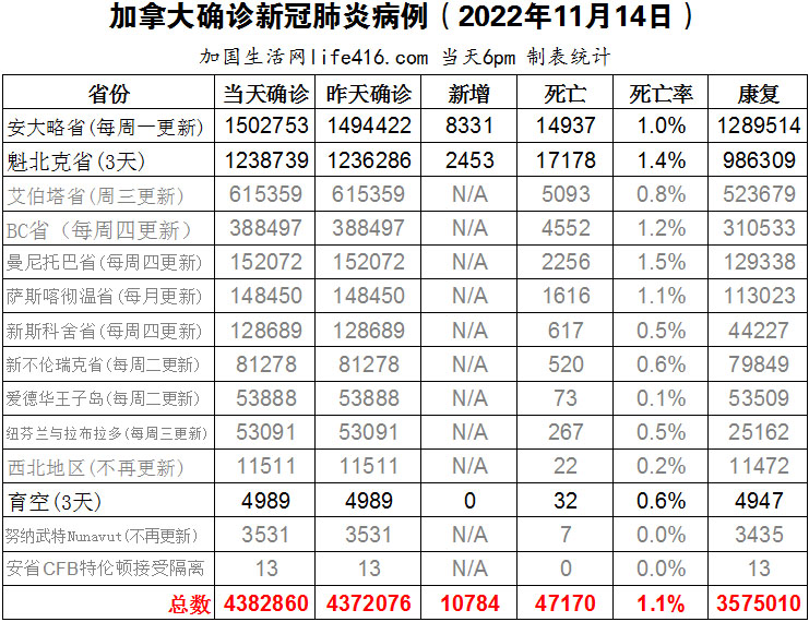 【加国生活网编译报道】截至2022年11月14日下午6点,加拿大新冠确诊病例总数为4382860(新增10784),死亡47170(新增164),安省确诊总数1502753(一周新增8331,死亡新增138)、魁省确诊总数1238739(3天新增2453,死亡新增26)。安省首席卫生官Kieran Moore博士在11月14日的新闻发布会上“强烈建议”安省省民在所有室内公共场所戴上口罩,因为最近几周激增的儿童病患已经让安省医院的一些儿科部门不堪重负。加国生活网专门制作了如下统计数据表: