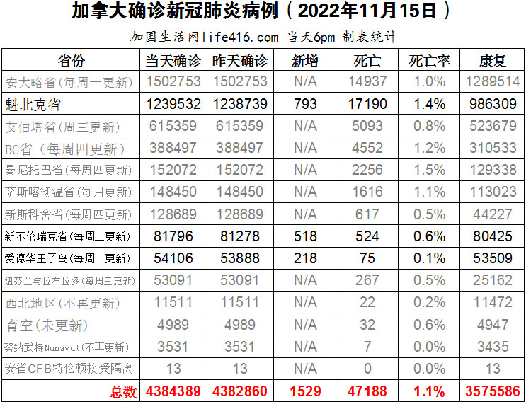 【加国生活网编译报道】截至2022年11月15日下午6点,加拿大新冠确诊病例总数为4384389(新增1529),死亡47188(新增18),魁省确诊总数1239532(新增793,死亡新增12)、新不伦瑞克省确诊总数81796(一周新增518,死亡新增4)、爱德华王子岛确诊总数54106(一周新增218,死亡新增2)。加拿大的一项最新研究发现,与辉瑞疫苗相比,Moderna疫苗患心脏病的风险要高两到三倍。该项发表在《美国心脏病学会杂志》上的研究发现,尽管病例很少见,但 40 岁以下的男性最有可能患上心肌炎和心包炎等心脏并发症,这些并发症通常会在第二次接种疫苗后的21天内出现。加国生活网专门制作了如下统计数据表: