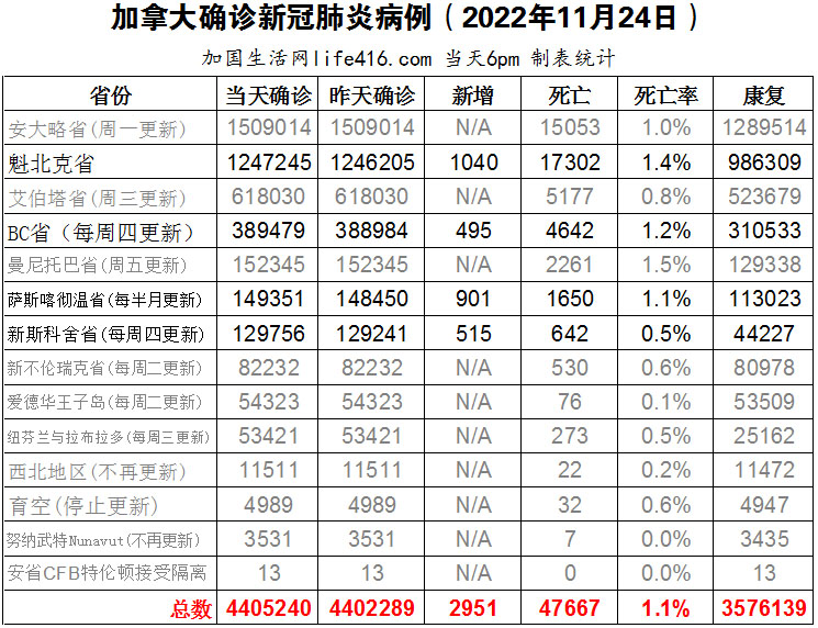 【加国生活网编译报道】截至2022年11月24日下午6点,加拿大新冠确诊病例总数为4405240(新增2951),死亡47667(新增89),魁省确诊总数1247245(新增1040,死亡新增10)、BC省确诊总数389479(一周新增495,死亡新增35)、萨省确诊总数149351(半月新增901,死亡新增34);新斯科舍省确诊总数129756(一周新增515,死亡新增10)。北美放射学会研究人员发现长期新冠的并发症可能是新冠病毒对脑部神经系统影响的结果。该研究旨在更好地了解与“长期新冠”相关的症状,包括注意力不集中、头痛、睡眠问题、针刺感以及抑郁或焦虑。加国生活网专门制作了如下统计数据表: