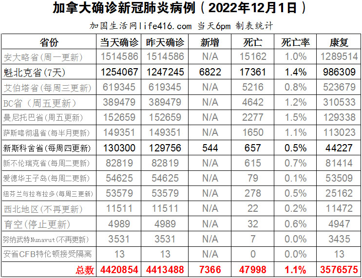 【加国生活网编译报道】截至2022年12月1日下午6点,加拿大新冠确诊病例总数为4420854(新增7366),死亡47998(新增74),魁省确诊总数1254067(7天新增6822,死亡新增59)、新斯科舍省确诊总数130300(一周新增544,死亡新增15)。今年冬天,在呼吸道疾病的“三重威胁”下,安省将继续提供为期六个月的免费新冠快速抗原检测。12月1日,安省卫生部长在省长福特的陪同下宣布了这一消息,同时还宣布了一项将用于支付护理学费的省级投资。加国生活网专门制作了如下统计数据表: