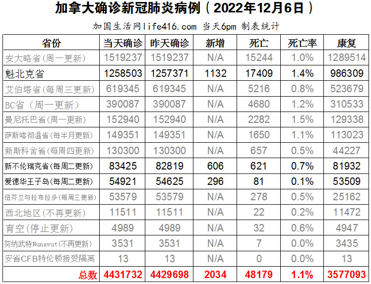 【加国生活网编译报道】截至2022年12月6日下午6点,加拿大新冠确诊病例总数为4431732(新增2034),死亡48179(新增27),魁省确诊总数1258503(新增1132,死亡新增19);新不伦瑞克省确诊总数83425(一周新增606,死亡新增6);爱德华王子岛确诊总数54921(一周新增296,死亡新增2)。最近,一项最新研究显示,科学家可能已经找到了人类在冬天患上更多呼吸道疾病的生物学原因。事实证明,冷空气本身会损害鼻子中发生的免疫反应。你有没有发现科学家所阐述的理论很熟悉,这不就是《黄帝内经》的“肺开窍于鼻、肺恶寒”吗。加国生活网专门制作了如下统计数据表:
