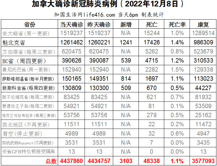 【加国生活网编译报道】截至2022年12月8日下午6点,加拿大新冠确诊病例总数为4437860(新增3103),死亡48338(新增106),魁省确诊总数1261462(新增1241,死亡新增11);BC省确诊总数390626(一周新增539,死亡新增35);萨省确诊总数150165(一周新增814,死亡新增47);新斯科舍省确诊总数130809(一周新增509,死亡新增13)。随着Moderna和辉瑞所生产的Omicron 二价疫苗已经向5岁及以上的所有人开放,美国食品和药物管理局FDA在12月9日批准了用于5岁以下儿童的最新新冠疫苗,即6个月大至5岁儿童也可以接种最新的二价疫苗。加国生活网专门制作了如下统计数据表: